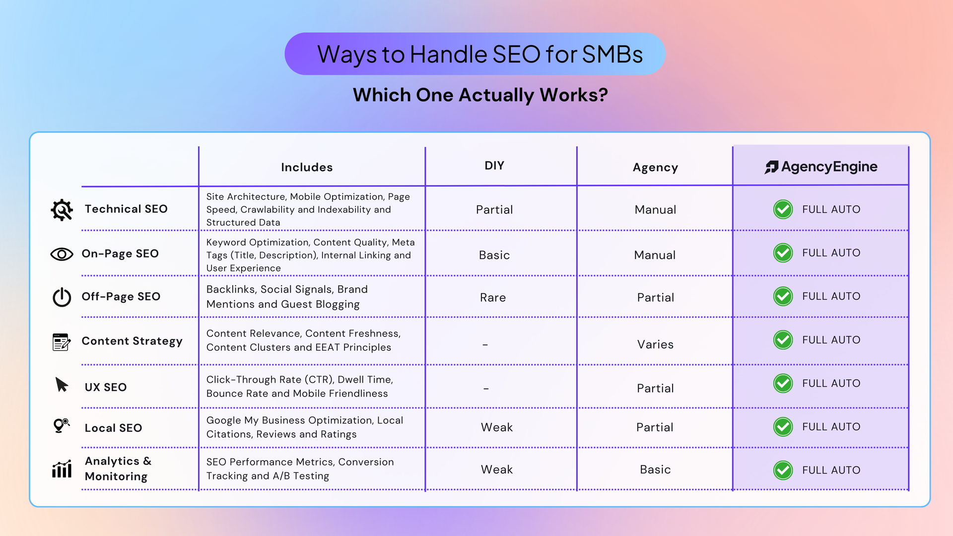 We've included an infographic below to show exactly what that looks like - breaking down every major SEO category and how each option stacks up. You'll see: