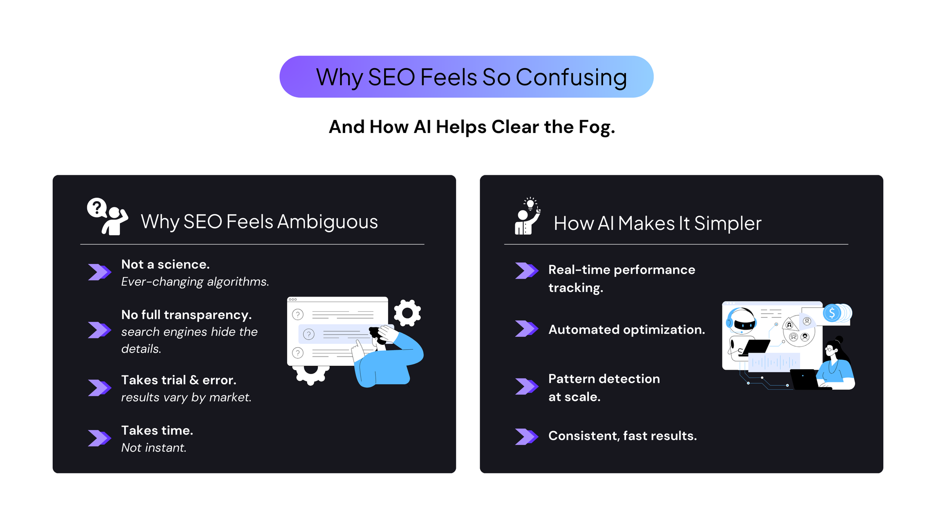 That's why AI-powered platforms offer a smarter way forward for BPMs supporting SMB clients. While SEO will always have some gray areas, AI helps reveal what's working, track changes in real time, and optimize strategies based on actual performance. Instead of relying solely on years of manual SEO experience, BPMs can now deliver clear, measurable results - faster and at scale.